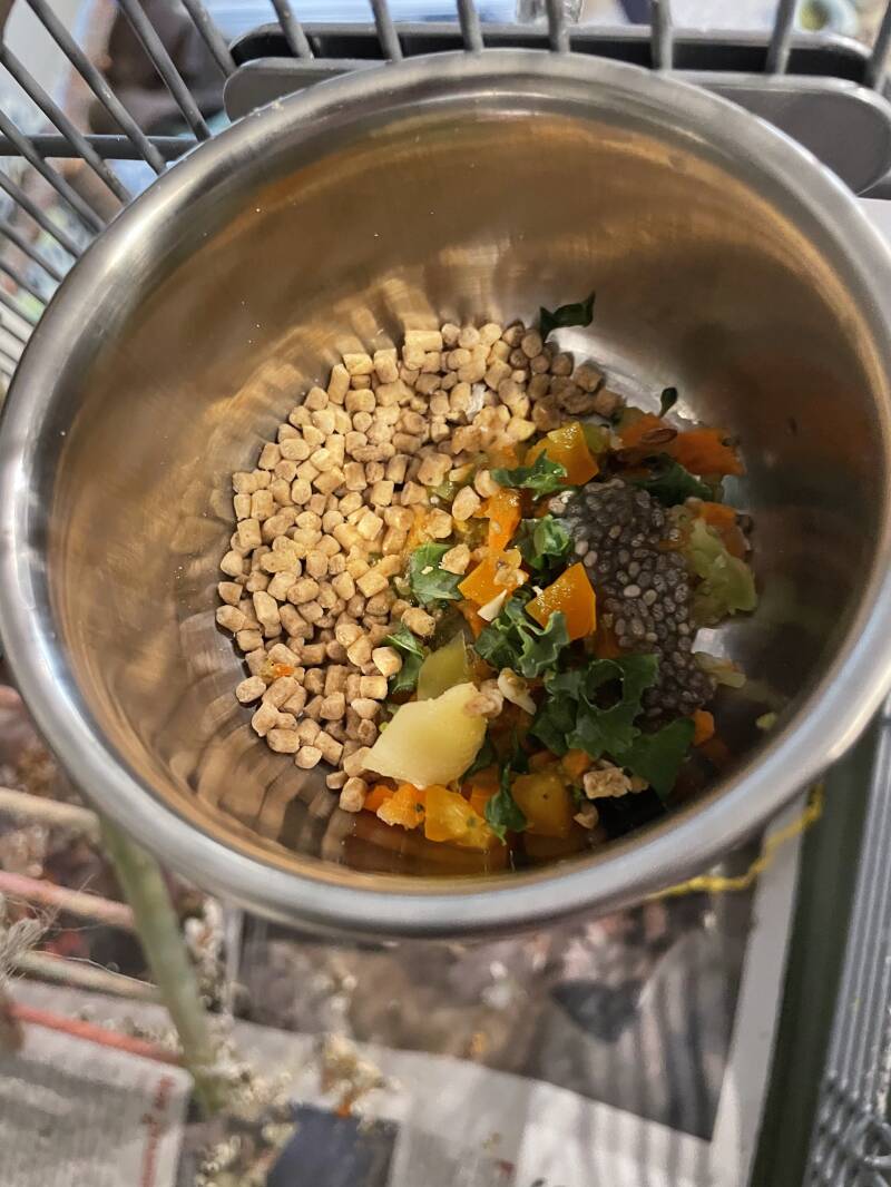 account! Go check them out! I made the birds a seagrass swing and they are really enjoying it! OH! I almost forgot! When I got Princeton I just assumed Princeton was a boy I don't know why (maybe cause I liked the name for a boy?) but I just found out SHE was a girl not a boy! Soooo I renamed her. I didn't really want a girl bird named princeton, I hope that makes sense. I named her Kiwi! Comment and tell me if you like the name! Today was fruit day and the birds got pear because they really like it! The pear is at the bottom of everything else BTW. They also got to try some ginger and kale!